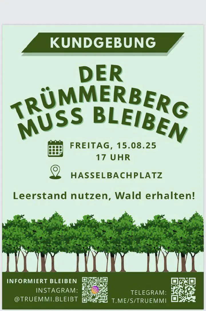 Für den Erhalt des Trümmi am Fr. 15.08. 17 Uhr. Kommt zahlreiche und bastelt kreative Schilder. 🌳💚✊